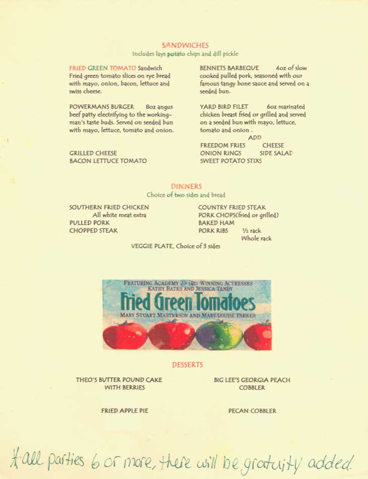 The Irondale Café, also known as The Original Whistlestop Café is not new to me. Located in Irondale, Alabama in the greater Birmingham area, it is a short 45 minute drive from our house. And the food is worth every minute of it! Originally begun in 1928, the business was ran after WWII by three women -Bess Fortenberry, Sue Lovelace & Lizzie Cunningham-who together turned the café into a sensation. It just so happens that our author, Fannie Flagg, is Bess Fortenberry’s niece.