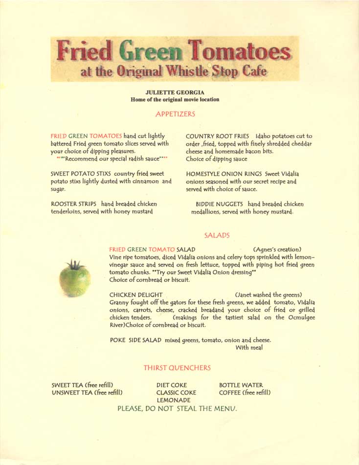Before the filming of Fried Green Tomatoes began, many of the buildings in Juliette were run-down and overgrown with ivy and vines. Needless to say, Hollywood gussied it up. If you pay attention, at the end of the film when Ninny returns to her home and finds it is not the quaint little town she remembers, you will see Juliette as it was before the clean-up and filming began. Today, the little town remains as it did during filming -quite picturesque and very Southern.